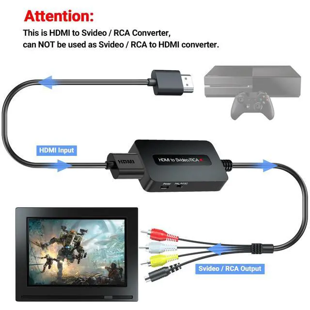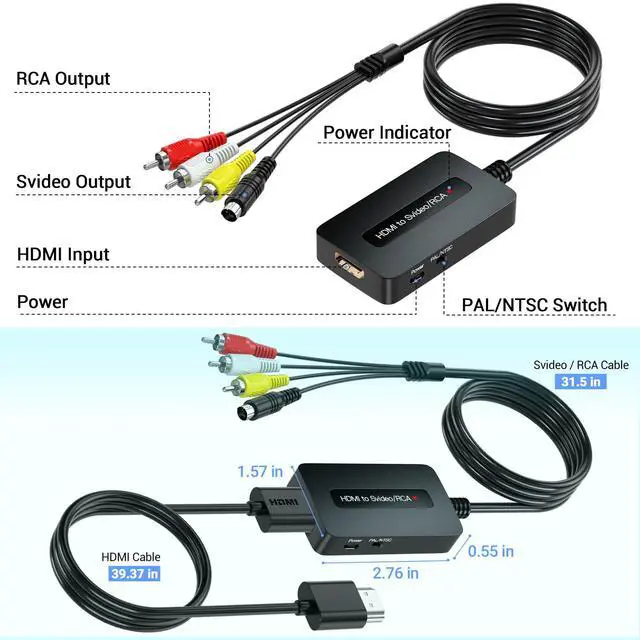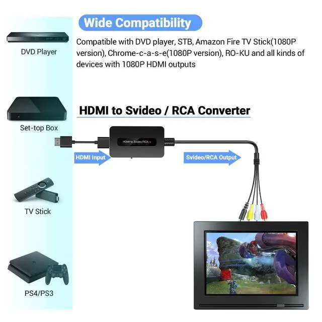 With scaling technology inside, this HDMI to Svideo RCA converter can easily convert 1080P HDMI signals into 480i/576i Svideo/RCA output.
