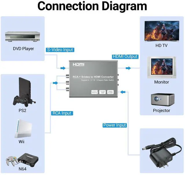 This Svideo RCA to HDMI converter is engineered to work with all devices featuring Svideo or RCA output, including VHS players, DVD players, STBs, Wii, PS1, PS2, N64, NGC, and more.