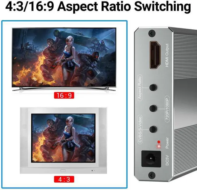 What sets this Svideo to HDMI converter apart is its scaling function! Supporting four aspect ratio modes (4:3/16:9/16:10/Full), it’s ideal for every scenario: 4:3 for retro game consoles (like PS1, N64, NGC) to preserve the original gaming experience, and 16:9 for DVDs or media players that require widescreen display. Additionally, this S-video to HDMI converter supports 720P/1080P HDMI output switching, ensuring optimal compatibility with your HDMI TV, monitor, or projector.