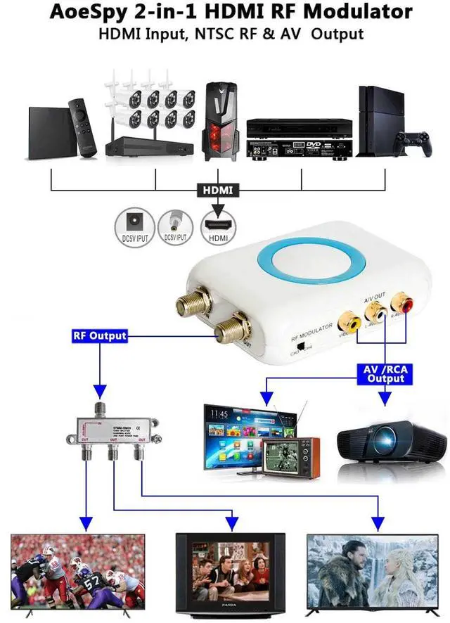 The TV modulator is a hdmi to rf and hdmi to rca converter combination which comes with hdmi input , coaxial F type female ( antenna / ANT ) output & CVBS RCA output ;This coax adapter converts hd digital signals into analog coaxial signals which helping hook up your Apple TV, Fire Stick , Fire TV, Roku etc. streaming media players or PS3 , PS4 , Xbox 360 / One , Nintendo Switch etc. game consoles or even DVD , Blu-ray , VCR , Laptop , PC or computer , TV tuner , satellite set-top / cable box etc. newer HDMI-equipped components with an old TV or video equipment ; Then you can watch movies / play games on channel 3 / 4 on older TV models (CRT) and other non-HDMI devices ; And even more , share program videos / pictures on other tvs in diffrent rooms or farther away from the hdmi video source with the ultra long distance transmission of RF signal because it is also a great HDMI extender.
