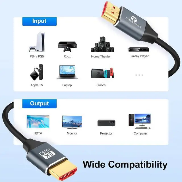 8K Thin HDMI Cables Flexible Slim HDMI Supports resolution & Refresh rate up to 8K@60Hz 4K@120Hz Transmission speed up to 48Gbps bandwidth Dynamic HDR 10 Variable Refresh Rate (VRR) Quick Frame Transport (QFT) & Quick Media Switching (QMS) Support eARC Can achieve more advanced audio signal control capabilities. Also backward compatible with HDMI 2.0 b/ 2.0 a/ 1.4 / 1.3 / 1.2 / 1.1 versionsWide Compatibility The length of 8K Silicone flexible HDMI is 10FT. Compatible with popular & Latest devices including PS5/PS4 X-box Series X/One/360 LG//Sony QLED TV Laptop Tivo Vizio DVD/Blu-ray player Projector etc. HDMI Cable For Game Enthusiasts 8K Soft HDMI cable delivers a super smooth picture of 4K@120HZ with Quick Frame Transport/Quick Media Switching and Auto Low Latency Mode.