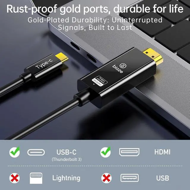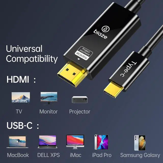 BiazeUSB C to HDMI Cable 10ft 4K@60Hz Aluminum Adapter Thunderbolt 3/4 Compatible Experience ultra-smooth 4K@60Hz HDMI 2.0 transmission with zero lag. Premium aluminum alloy connectors enhance heat dissipation for MacBook Pro/Air XPS and Thunderbolt 3/4 devices. USB C HDMI Cable for MacBook Pro & Multi-Screen Productivity Instantly convert your MacBook Pro HDMI port to dual monitors or mirror Galaxy S23/S24/iPhone 15 to projectors. Ideal for 4K office presentations gaming on PS5 or streaming to TVs. Plug-and-Play USB C to HDMI 4K 60Hz 10ft Cable No drivers required USB C to HDMI 10ft works instantly with iPads Chromecast and Windows laptops.