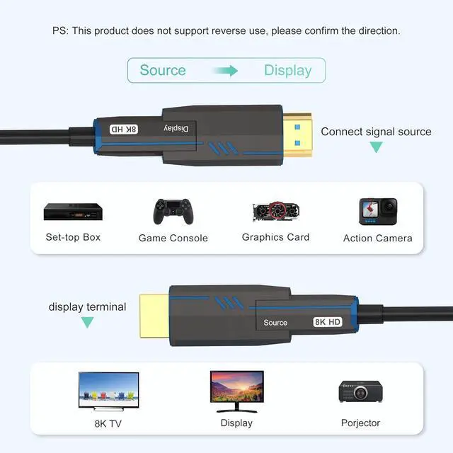 The Ultimate Experience: The optical fiber complies with the HDMI 2.1 standard supports 8K@60HZ 4K@120HZ and is backward compatible with 1440P and 1080P resolutions. Supports bandwidth up to 48Gbps and is backward compatible with HDMI 2.0 / 1.4 / 1.3 / 1.2 / 1.1D etachable Connectors Slim and
