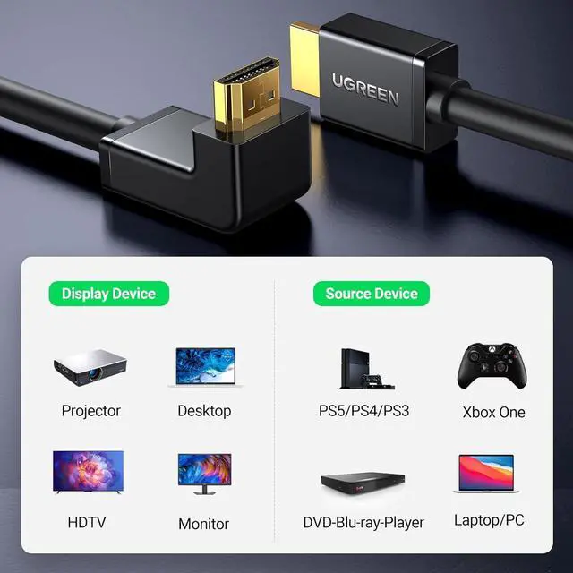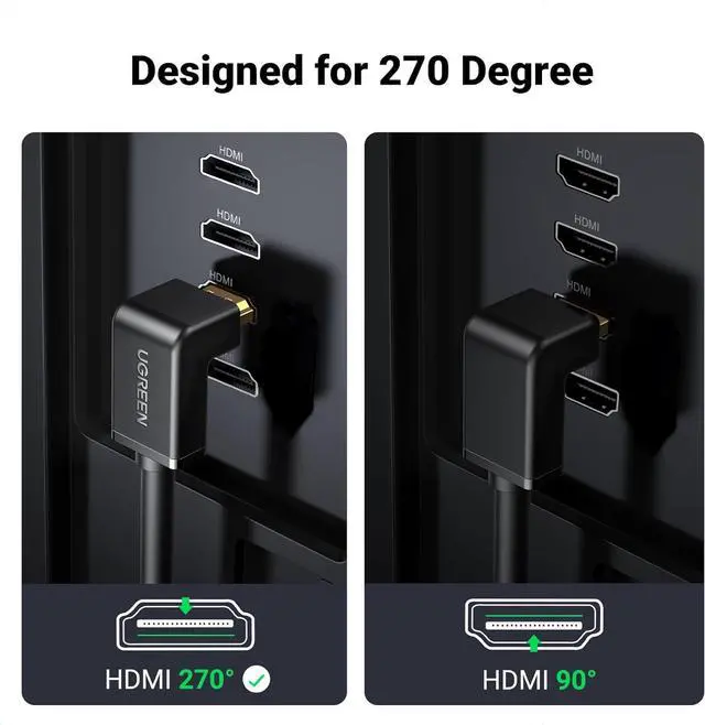 Right Angle HDMI Cable: 270 degree right angle design makes the cable better fits for wall-mounted devices solving the embarrassment of limited spaces between wall and device4K