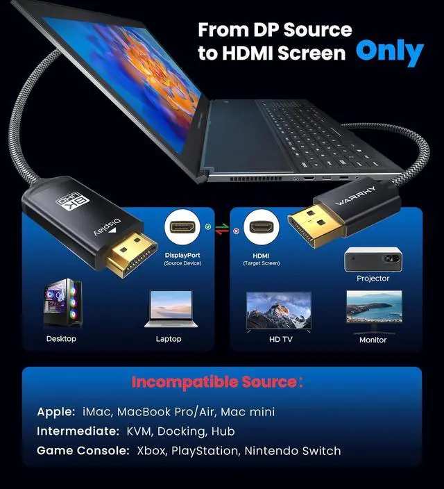 *Note: this 8K displayport to hdmi cable is a ONE-WAY cable specifically designed to convert from DisplayPort sources to HDMI displays.