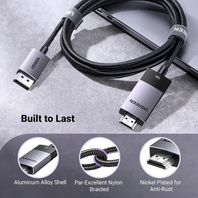 HDMI Cable: UGREEN DP to HDMI cable enables you to connect DP devices (e. g. PC laptop or graphic cards) to a monitor projector HDTV for audio video signal transfer. It supports up to 8K@60Hz resolution and high refresh (backward supports 4K@120Hz) offering you realistic 3D view and tear-free immersive experience.
