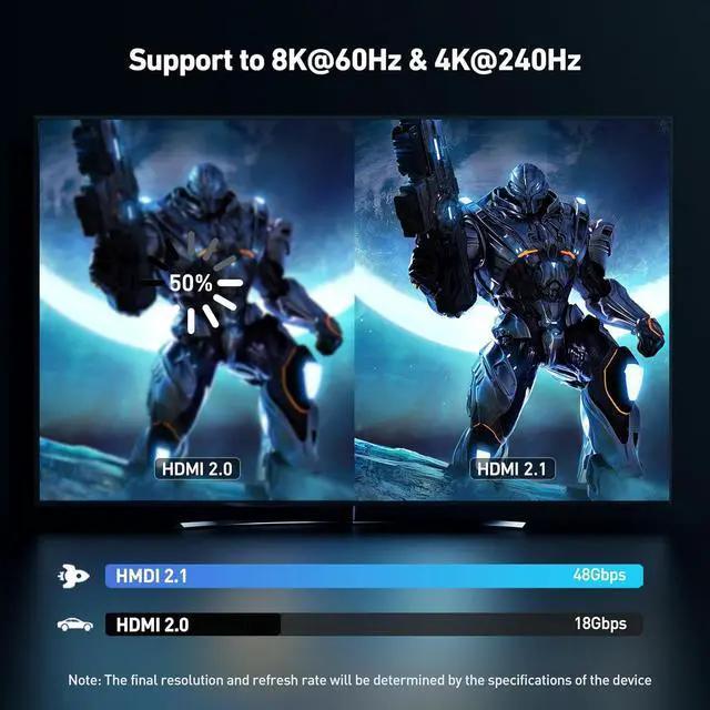 8K@60Hz HDMI 2.1 Cable The 8K HDMI Cable comply with HDMI 2.1 b specification uses the most cutting-edge technology is compatible with 8K@60Hz and 4K@120Hz increased bandwidth capability supports up to 48Gbps. With 8K HDMI's unique dynamic HDR and 12 Bit color processing technology each scene of the video is every frame with more ideal depth brightness detail contrast and wider color gamut. Multi-Feature Dynamic HDR support ensures every moment of a video is displayed at its ideal values for depth detail brightness contrast and wider color gamutson a scene-by-scene or even a frame-by-frame basis. Source-Based Tone Mapping (SBTM) is a new HDR feature is especially useful in cases where HDR and SDR video or graphics are combined together into a single picture such as picture-in-picture or a program guide with an integrated video window.