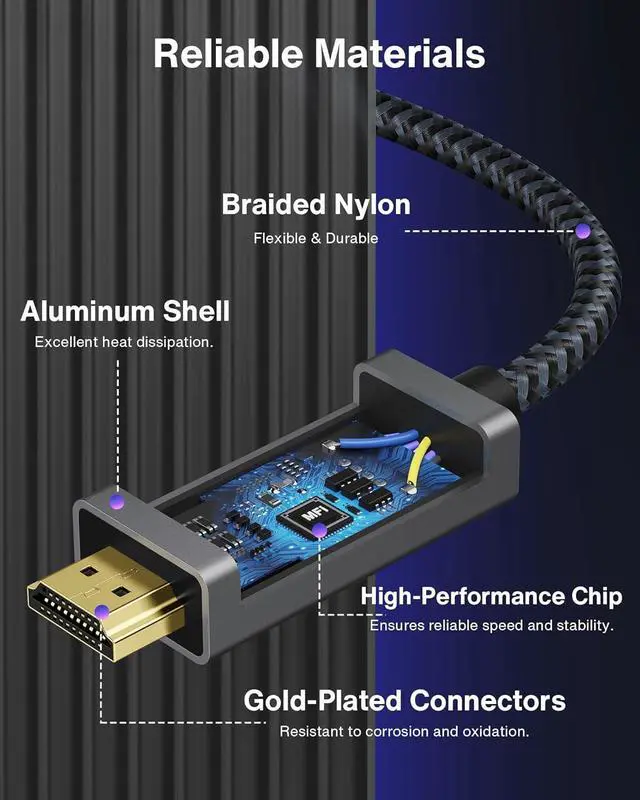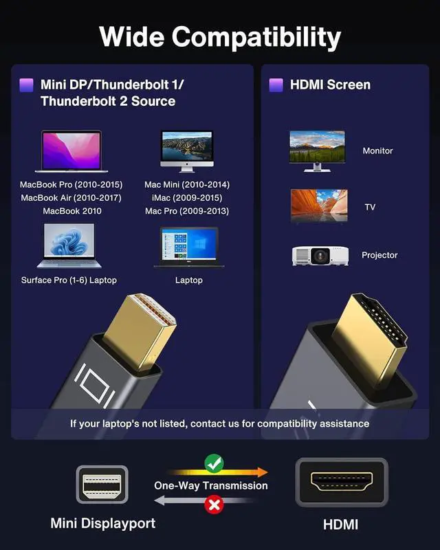 [4K@60Hz Ultra HD] Dive into ultra-clear 4K visuals with this premium Mini DisplayPort to HDMI cable (Thunderbolt 1&2 Compatible) supporting 4K@60Hz and 1080P@120Hz resolutions. It's the perfect accessory for detailed work immersive gaming and impactful presentations. (NOT compatible for Thunderbolt 3/4/USB/Type-C)[Unsurpassed Durability]Our Mini Display Port to HDMI Cable (Thunerbolt 1&2 compatible) features a 24K gold-plated connector and pure copper wire guaranteeing stable transmission without any flickering or frame drops. We've also reinforced stress points to prolong its lifespan and nylon braided jacket provide ultimate durability resisting fraying cracking and even pet damage. [Practical Design] The aluminum shell ensures efficient heat dissipation and added corrosion resistance.