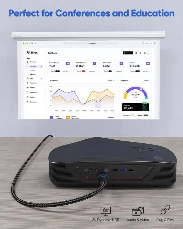 HDMI Cable 25 FT 8KDesigned for long distance video transmission the cable is upgraded with multiple internal shielding layers to ensure stable and clear signal transmission. Long HDMI Cable 25 FT supports 8K@60Hz 4K@120Hz ultra high resolution eARC/ARC Ethernet Dynamic HDR 3D HDCP 2.2 & 2.3 up to 48Gbps bandwidth for Ultra HD 8K videoNewest Upgrade Design HDMI 2.1D esigned with black+blue color scheme of the 8K@60Hz 25FT HDMI Cable is extremely attractive. The flexible nylon braided hdmi cable over 25000+ bending tests 30AWG copper wire triple shielding and upgraded smart chip ensuring long-term performance without future cable replacement costs during home upgradesStunning Visual EffectsWith Dynamic HDR 3D and Dolby Vision the 8K HDMI 25 foot can fully express the brightness detail contrast and richer colour gamut of images and video.