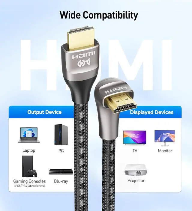 Unleash the full potential of 8K with the Cable Matters 8K HDMI Cable; Cable supports high bandwidth HDR with a 48 Gbps bandwidth as specified in HDMI 2.1 standard with more than 2x bandwidth compared to HDMI 2.0 HDMI 2.0 b and 4K HDMI cablesLeft-angle HDMI cable connector of the HDMI cable 8K is the perfect fit for wall-mounted television or devices in entertainment centers; 270 degree HDMI cable reduces the stress placed on the HDMI connector; Braided 8K HDMI cable features a braided cable jacket for tangle and fray protection and premium metal connectors and gold-plated contacts provide unmatched durabilityHigh speed HDMI video resolution support up to 8K (7680x4320) including HDMI 2.0 a cable 4K Ultra HD HDR resolutions with the 8K HDMI to HDMI cable; Hear immersive audio for surround sound 7.1 and 5.1 channels including Dolby Atmos and DTS X with this feature filled HDMI monitor cableGaming 8K HDMI cable is compatible with the PS4 Pro Xbox One and Apple TV 4K with advanced features; 8K HDMI cable is compatible with the Xbox Series X 8K and PlayStation 5 8K; 8K gaming cable is compatible with Nvidia RTX 3090 and Nvidia RTX 3080 graphics cards for the ultimate 8K gaming experienceConnect with confidence with this HDMI cable with full HDMI feature support for the latest video audio and gaming features on your TV or monitor; Enjoy 4K streaming video with this Dolby Vision 4K HDMI cable; HDMI 4K 60Hz cable is backward compatible with HDMI 2.0 cable and supports 4:4: 4 RGB HDR 12-bit color and Dolby Vision; Fully compatible with HDMI ARC (Audio Return Channel) features for immersive audio even through an A/V Receiver