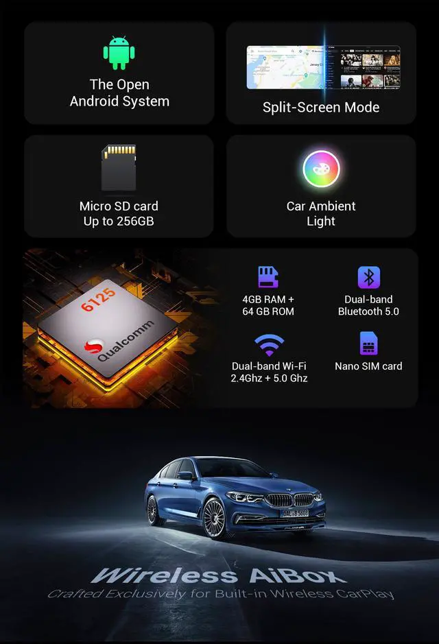 Dual-System "Vehicle-to-Vehicle" Connectivity: The unique "vehicle-to-vehicle connection" means it intelligently bridges two systems. It connects to your car's factory wired CarPlay/Android Auto port, and simultaneously provides wireless CarPlay/Android Auto for your phone. You can seamlessly switch between the Android AI interface and your phone's native interface.