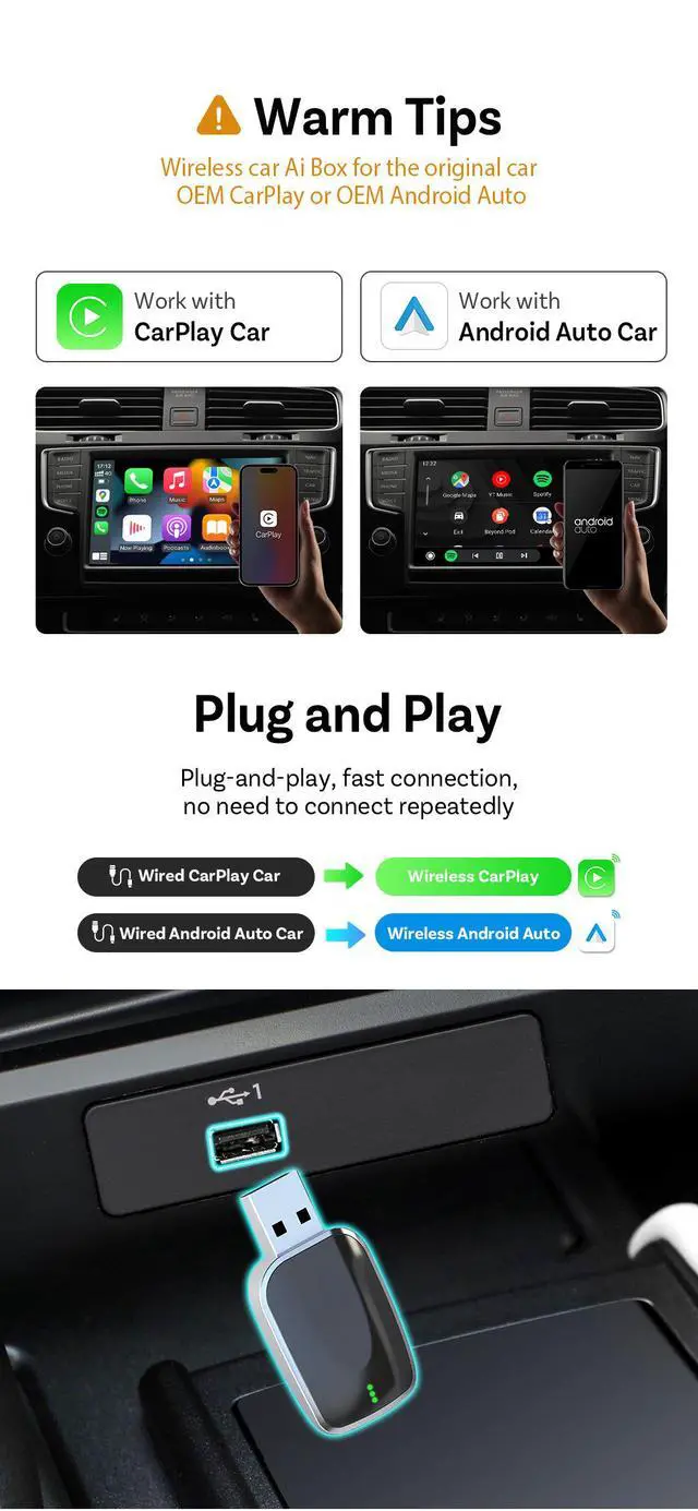 Plug-and-Play for Factory Systems: Designed for direct integration. Simply plug the box into your car's original USB data port (the one used for CarPlay/Android Auto). It requires no complex wiring or modifications, making installation effortless.