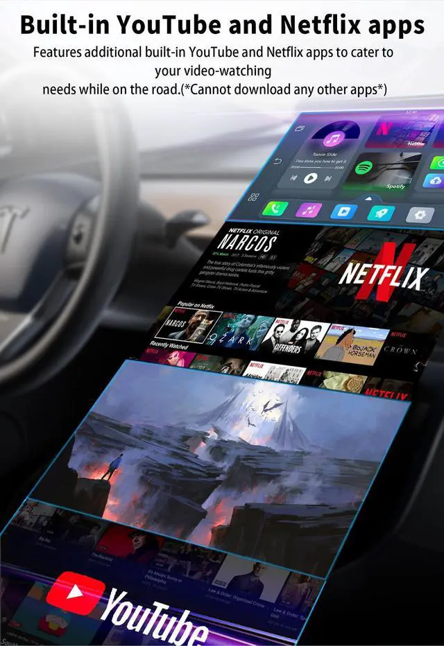 All-in-One Smart Digital Video Hub: This is a standalone Android-powered AI digital video box for your car. It seamlessly integrates Wireless CarPlay/Android Auto for phone mirroring with direct access to YouTube, Netflix, Disney+, and thousands of streaming apps from an app store, all on your factory screen.