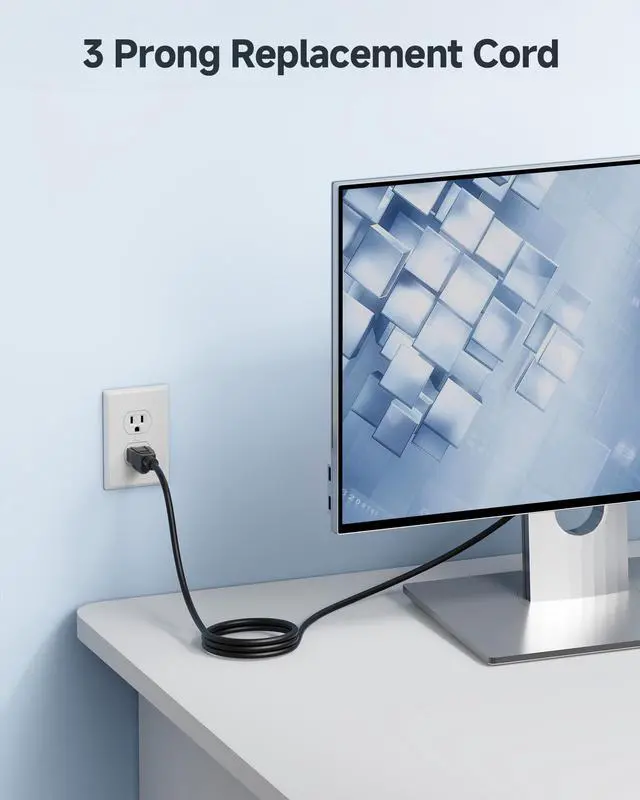 3 Prong Replacement Cord: This 3 prong replacement cord works with most desktop computers, HDTVs, monitors, ceiling-mounted projectors, powered speakers, laser printers, and more. This computer cable connects your devices IEC C13 equipment socket to a standard NEMA 5-15P 120V AC outlet.