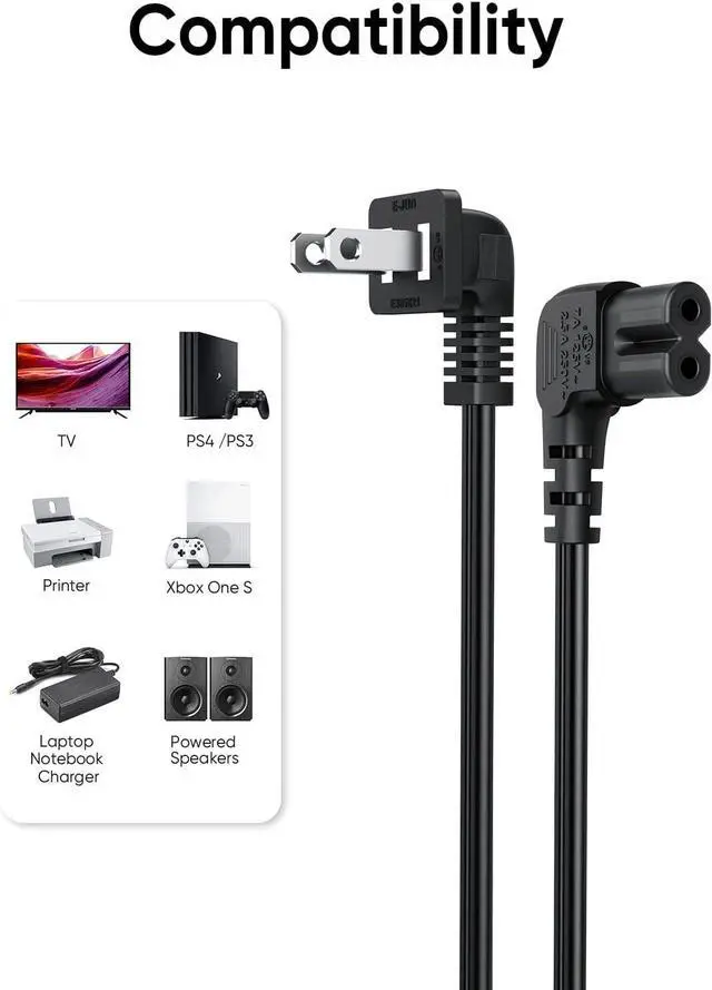 Compatibility: This power cord with a 90-degree angle is a great replacement for most models of TVs, scanners, printers, projectors, PCs, powered speakers, and gaming consoles that have a 2 prong figure 8 shotgun power connector. This is a non-polarized power cord; please check your device before purchasing.