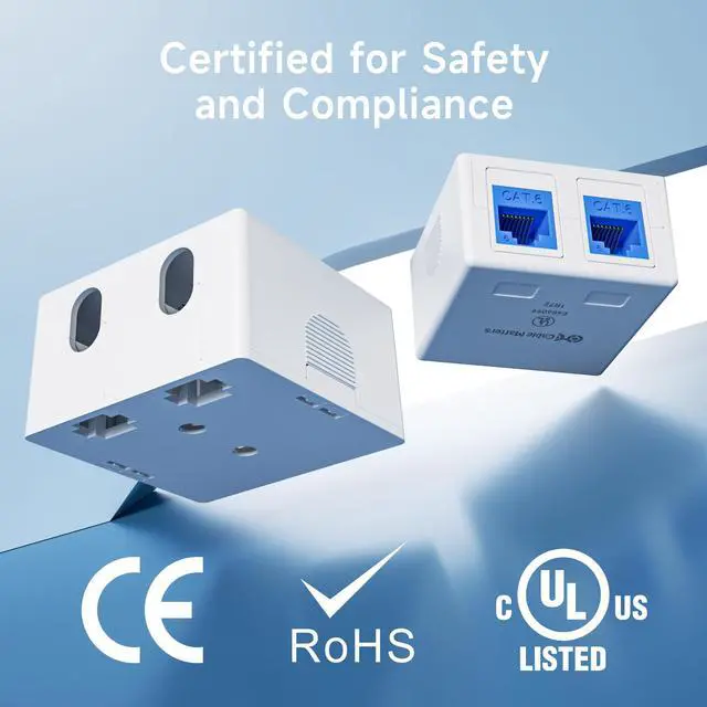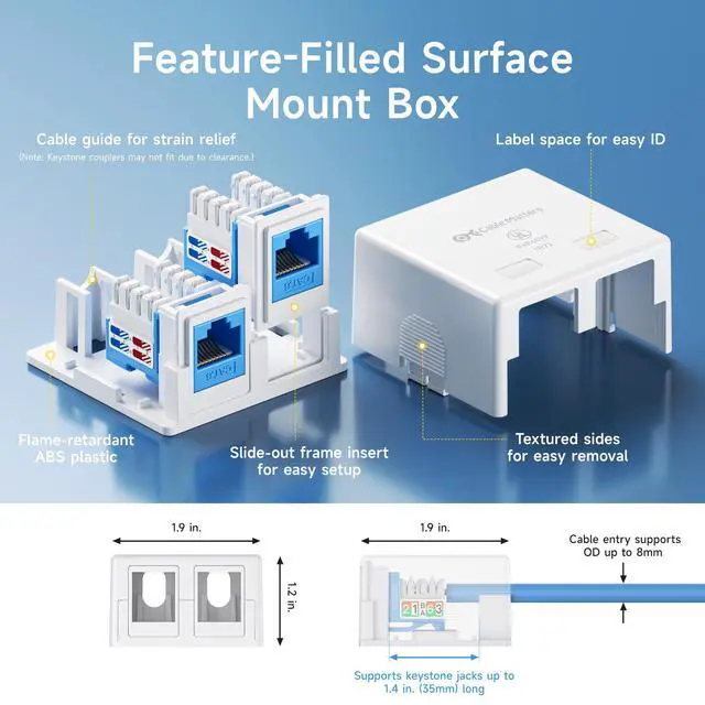 Simple installation of dual keystone jack inserts blank box includes a slide-out frame for easy insertion of the keystone jacks into the box; cable strain relief is provided by a cable guide and a place to connect the included cable tie to secure the cable; Surface mountable with the included screws or double stick tape.