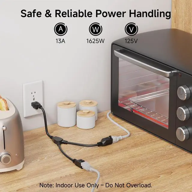 Expand a Single Outlet: AC plug splitter cords create additional grounded outlets for connecting electrical devices when only one outlet is available. The 2 outlet extension cord splitter offers a reliable solution for holiday lights, a gaming get-together, or a DJ party setup.