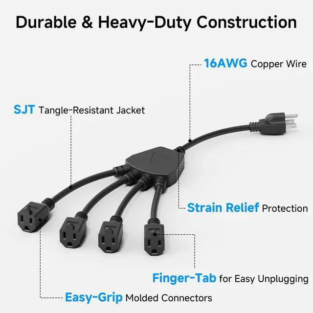 Safe & Reliable Design: Built with a standard NEMA 5-15P grounded power plug and four NEMA 5-15R heavy duty receptacles, this power splitter 3 prong cord supports up to 13A / 125V / 1625Woffering safe and dependable performance for everyday use.