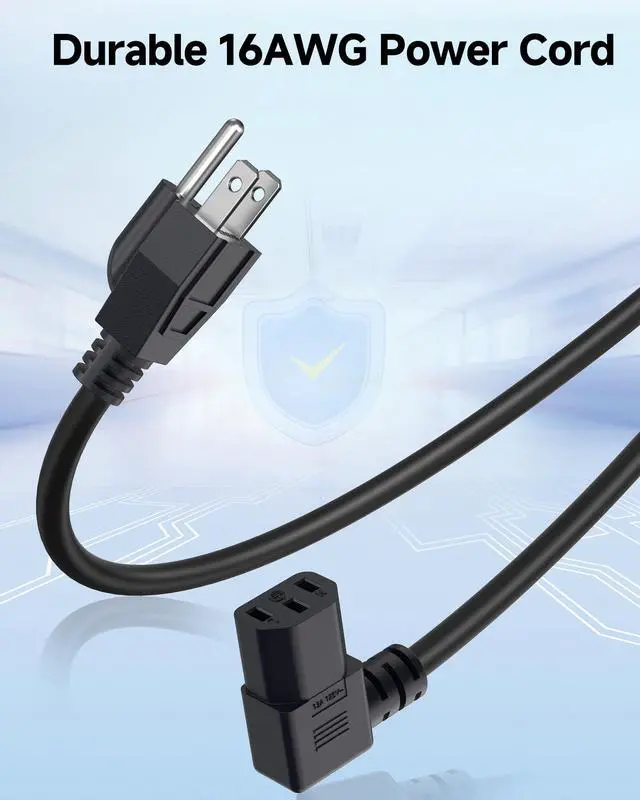 Heavy-Duty and Safe Performance: The 16 AWG gauge 90-degree PC power cord supports up to 13 amps and 300 volts, making it suitable for common 10 amp/125 volt power applications. Its thicker yet flexible construction provides enhanced safety and reliability over typical 18 AWG cables supplied with many devices.