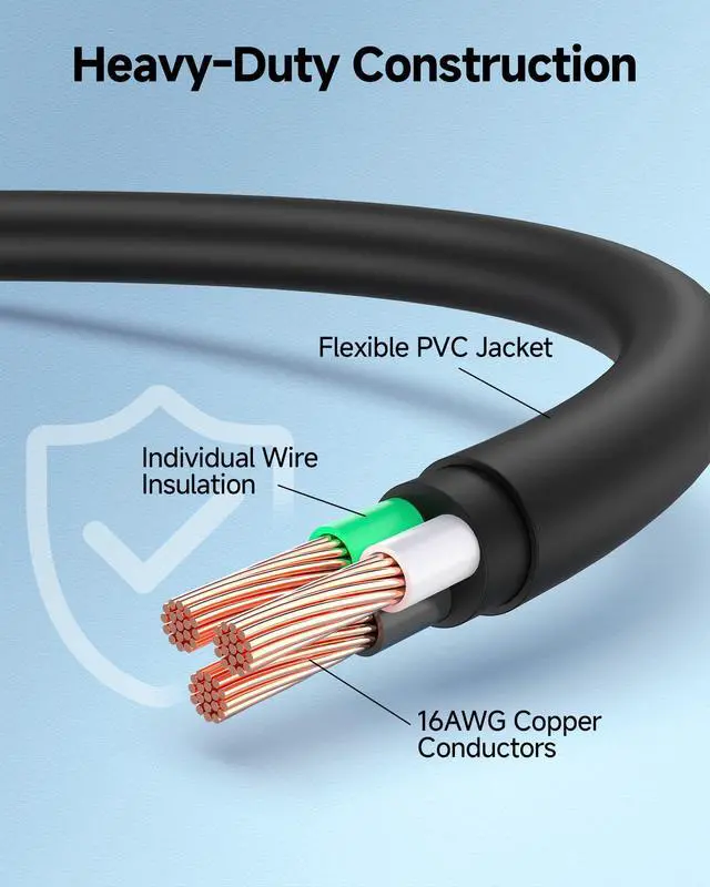 Heavy-Duty and Safe Performance: The 16 AWG gauge 90-degree PC power cord supports up to 13 amps and 300 volts, making it suitable for common 10 amp/125 volt power applications. Its thicker yet flexible construction provides enhanced safety and reliability over typical 18 AWG cables supplied with many devices.