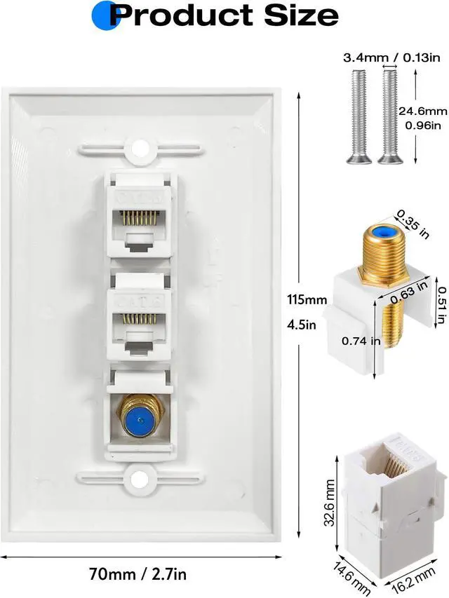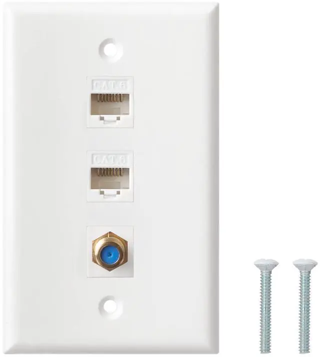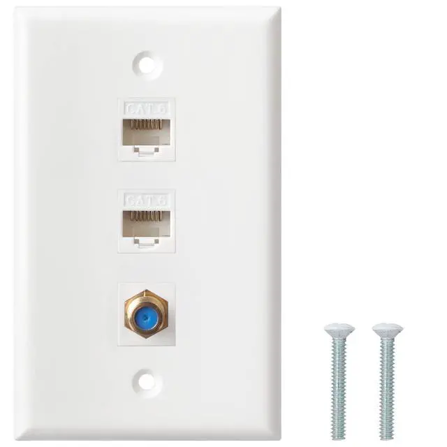 Easy to install - Installs like any light switch plate with just a standard screwdriver. Simply plug the cable into the front and back, then connect it to your terminals. Standard size 2.76"W x 4.53"H wall plate with 2 screws and removable Cat 6/Coax keystone jack.
