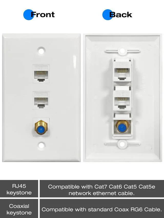 Ethernet keystone is compatible with Cat7, Cat6, Cat5, and Cat5e network ethernet cables. Coax keystone is compatible with standard Coax RG6 cable.