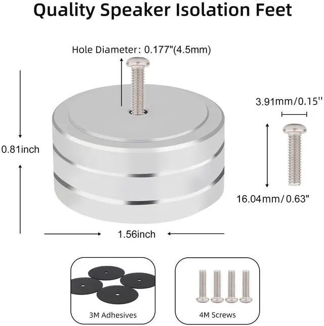 MaterialAudio isolation feet made of aluminum, featuring removable non-slip rubber rings, high hardness, high density, low harmonic vibration point, and high damping. Each speaker spike pad can support up to 220 lb, allowing one isolation foot to support around 880 lb. Middle Hole: 4.5mm (0.17 inches).