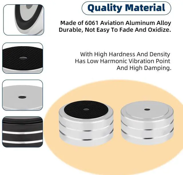Applicable objectsSubwoofer feet, audio equipment feet, amplifier feet, speaker feet, turntable isolation pads, CD/DAC/AMP/DVD players, cassettes deck, recorders, home audio riser pads, isolating speakers, subwoofer isolation feet, PC case feet, audio isolation feet, and other audio equipment.