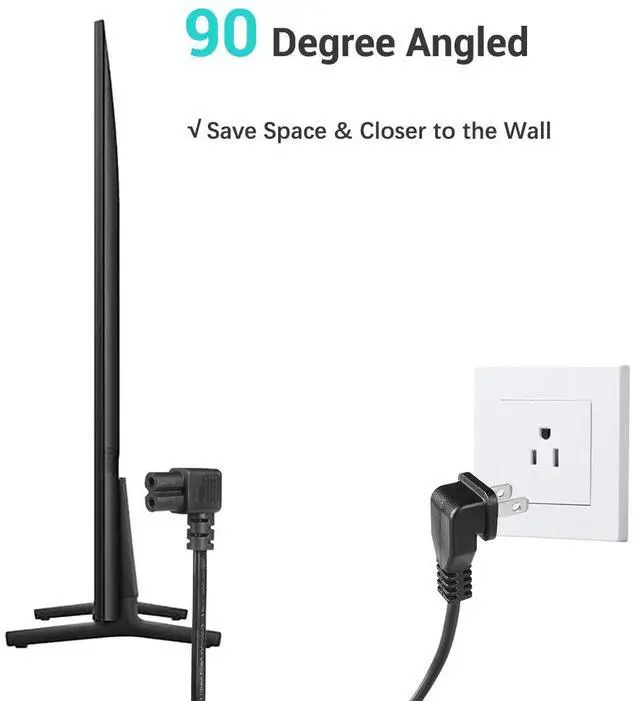 Compatibility Non-Polarized 2 Prong Figure 8 Power Cord (IEC320 C7 to NEMA 1-15P), suitable for LED LCD TVs, printers, speakers, and other devices that require a 2-slot power cord.