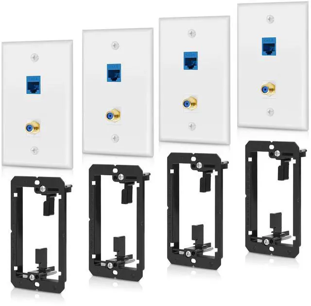 Package Include: Standard size wall plates measuring 2.75"W x 4.5"H, along with 4 x RJ45 Cat6 blue keystone jacks, 4 x coax F-type keystone jacks, and 4 x 1-gang black low voltage mounting brackets, including mounting screws.