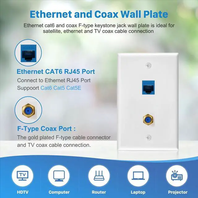 Cat6 and Coax F-Type Wall Plates: The wall plate fits flush to the wall and allows the ethernet/network cable to run from one side to another. The ethernet RJ45 keystone jack is compatible with Cat6, Cat5, and Cat5e network ethernet cables. This wall plate is ideal for satellite, ethernet, and TV coax cable connections. Conceal the cables in the wall for a neat appearance, eliminating wire clutter. Enhance the décor of your home or office while hiding cables.