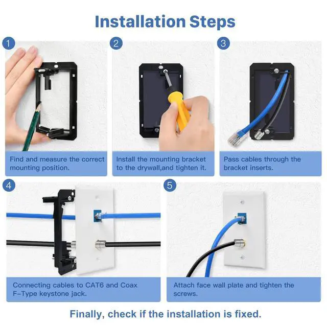 Wide Applications: The snap-in retaining clip ensures that the ethernet cables are securely connected. The RJ45 keystone jack and coax F-type keystone jack coupler are removable, making future replacements easy. The female to female Cat6 inline couplers and 2-port standard size wall plates offer a comprehensive solution for networking, audio, video, and various DIY projects in your home or office.