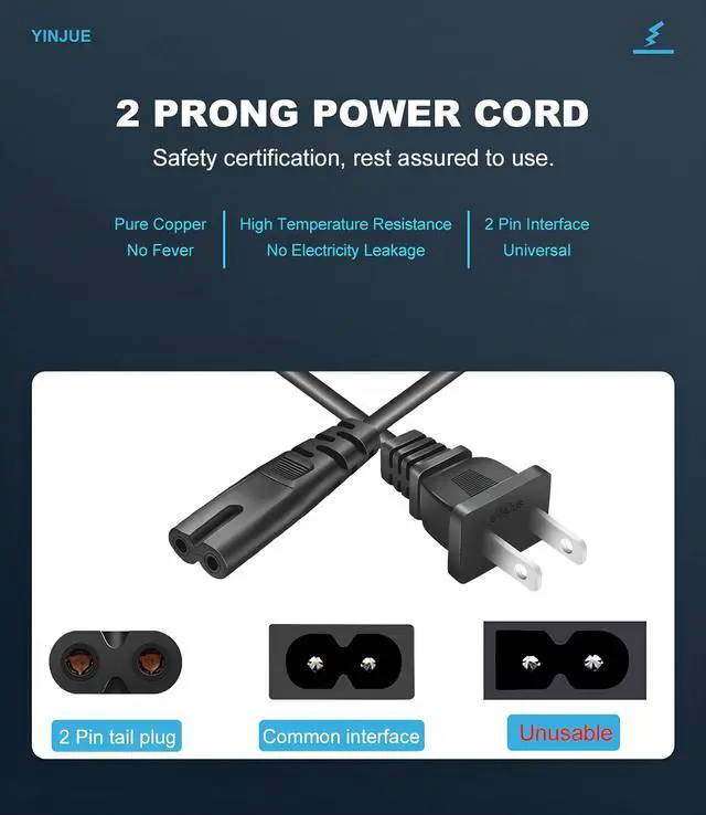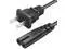 [Features Specs]: (Figure 8) 2 Prong AC power cord, Extra-long 6 feet cable cord. Non-polarized, 105°C 300V VW-1 FT2. Connector Plug: IEC-60320 (IEC320) C7 to NEMA 1-15P