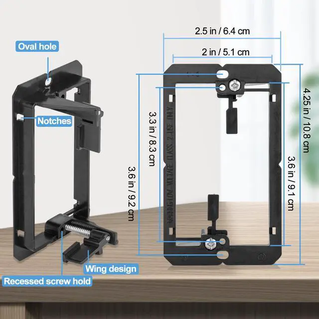 Easy to InstallHorizontal or vertical mounting. Fully adjustable to fit various wall thickness from 1/4" to 1". The bracket wings secure when mounting screws are tightened.