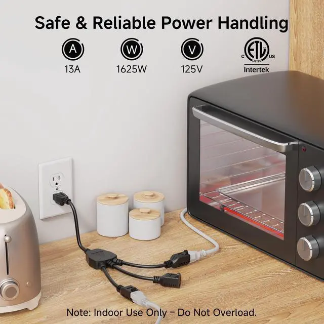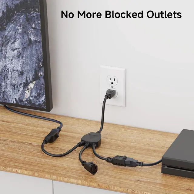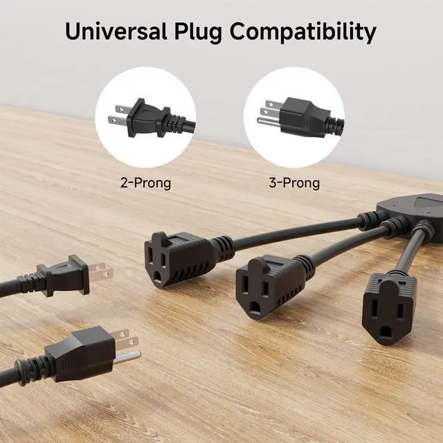 AC plug splitter cords create additional grounded outlets for connecting electrical devices when only 1 outlet is available; The 3 outlet extension cord splitter offers a reliable solution for holiday lights, a gaming get together, or a DJ party setup.