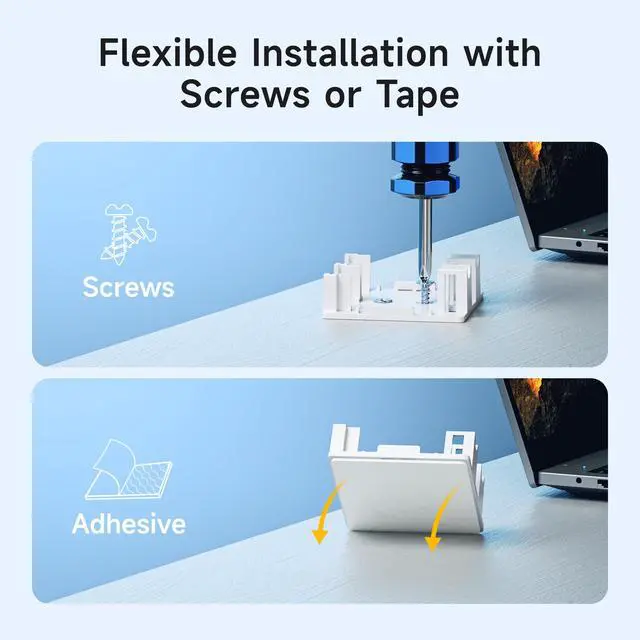 The dual keystone jack inserts blank box features a slide-out frame for convenient insertion of keystone jacks, with cable strain relief provided by a cable guide and a tie attachment point to secure the cable. It can be surface mounted using included screws or double-sided tape.