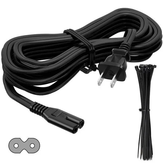 2 Prong Power Cord 25 FT, Non-Polarized AC Power Replacement Supply Cable, 7A, 125V, ETL Compatible, TV, Xbox, Laptop, Printer, C7 to 1-15P, Black, with 25 Ties