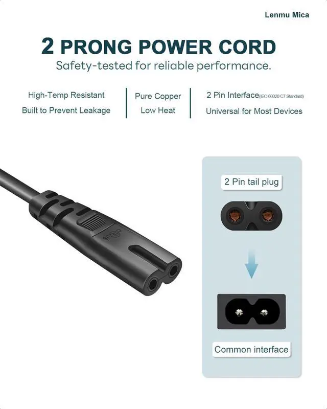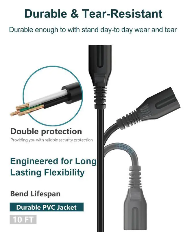 Power specs: 2-Slot Design | Connectors: IEC-60320 C7 (Figure 8) to NEMA 1-15P (Non-Polarized) | Electrical Rating: 125V 10A, 18AWG(0.824mm²), 90°C 300V | Length: 10 feet