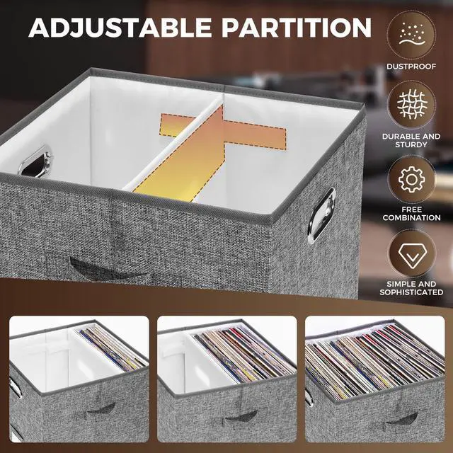 Adjustable DividersEquipped with adjustable dividers, the vinyl record organizer box allows for secure and snug placement based on the number of records. This ensures that your vinyl records/LPs remain stable and protected during storage or transportation, preventing any shifting or sliding.