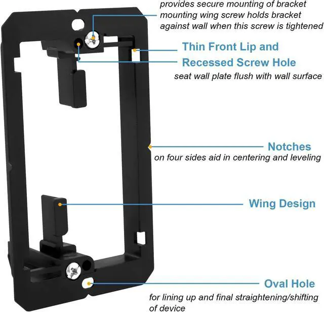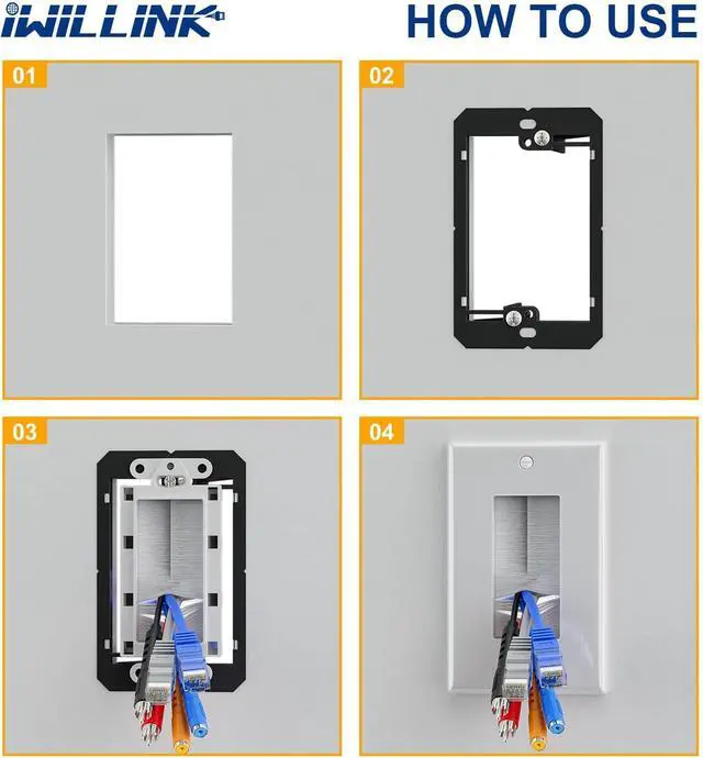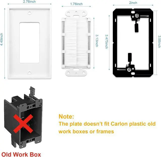Easy to Install: Single gang low voltage mounting bracket adjusts to fit 1/4-inch to 1-inch thick wall board, paneling, or drywall. Wall plates mount flush against wall. Insert the brush into the outer casing and place on the wall. Run cables through wall work well, single gang wall plate easily creates cable access from any wall.