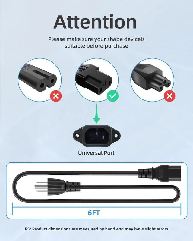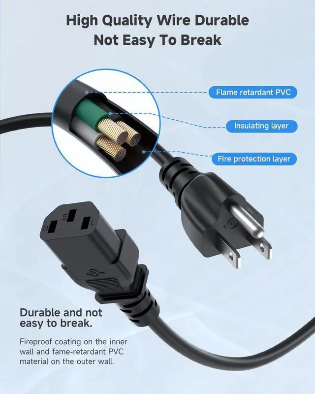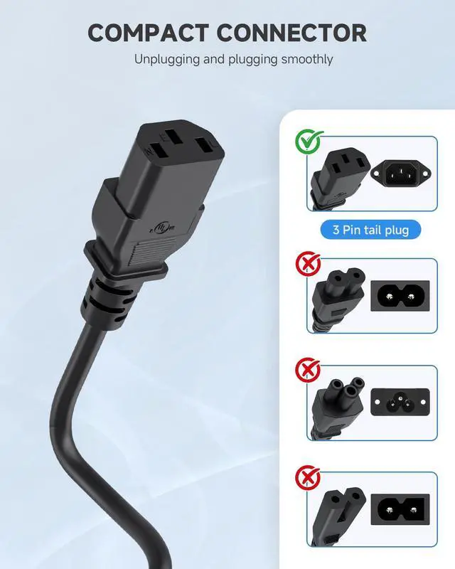 Features and Specifications: This power cord features a 3-prong AC design and comes with an extra-long 6-foot cable, providing flexibility in placement. It meets UL standards with SVT 3C*18AWG (0.824mm2) 105°C 300V VW-1 FT2 specifications. The connector plug conforms to (IEC320) IEC-60320 C13 to NEMA 5-15P standards.