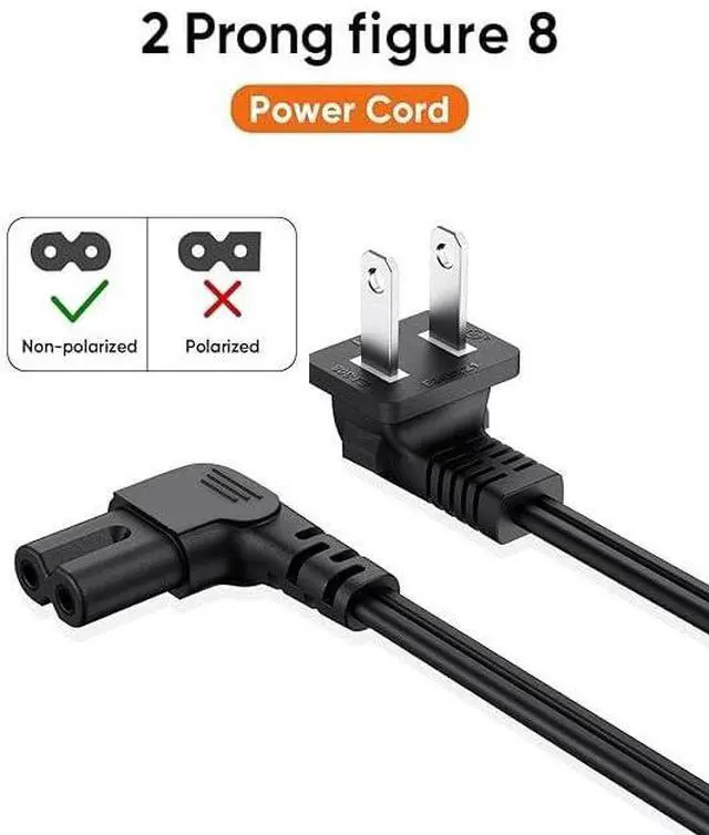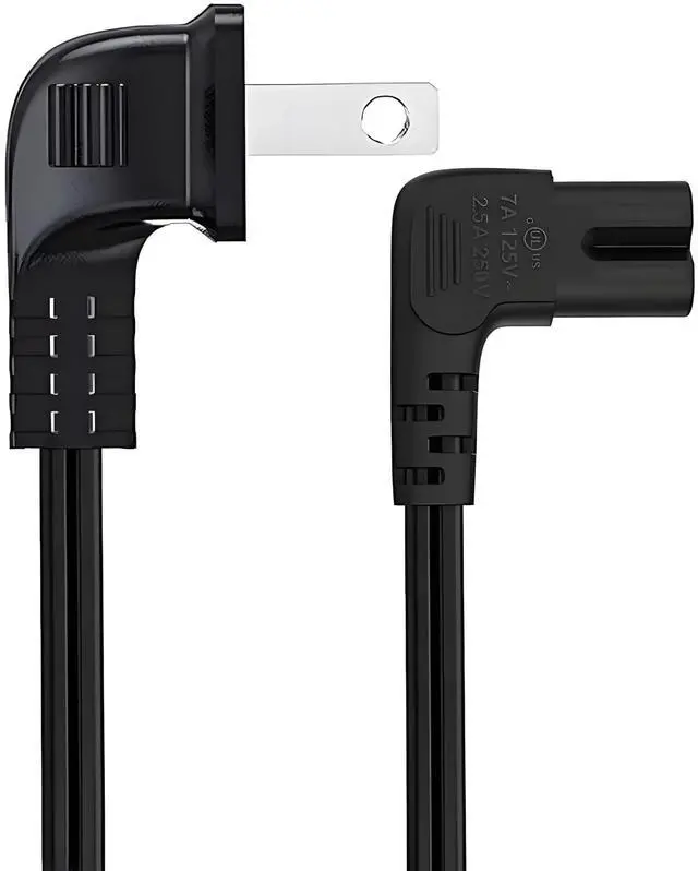 COMPATIBILITY: This power cord with a 90-degree angle is a suitable replacement for most TV models from various brands, as well as scanners, printers, projectors, PCs, powered speakers, Sound Bars, and gaming consoles that have a 2 prong figure 8 shotgun power connector.