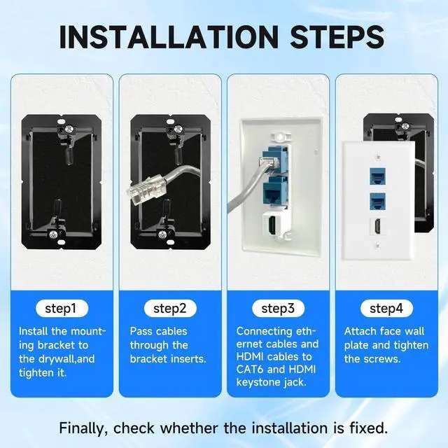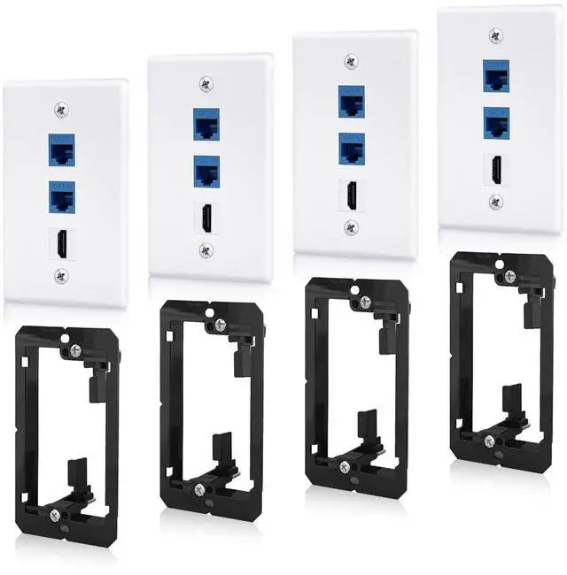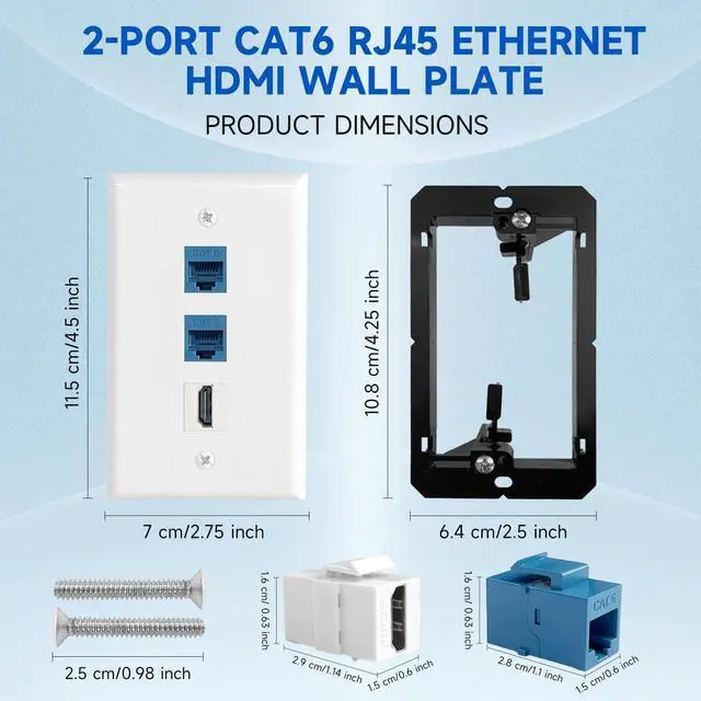 Package Include: 2.75"W x 4.5"H standard size wall plates, 4 x HDMI keystone Jacks, 8 x RJ45 Cat6 blue keystone Jacks, 4 x 3-port wall plates, 4 x 1-gang black low voltage mounting brackets, and mounting screws.