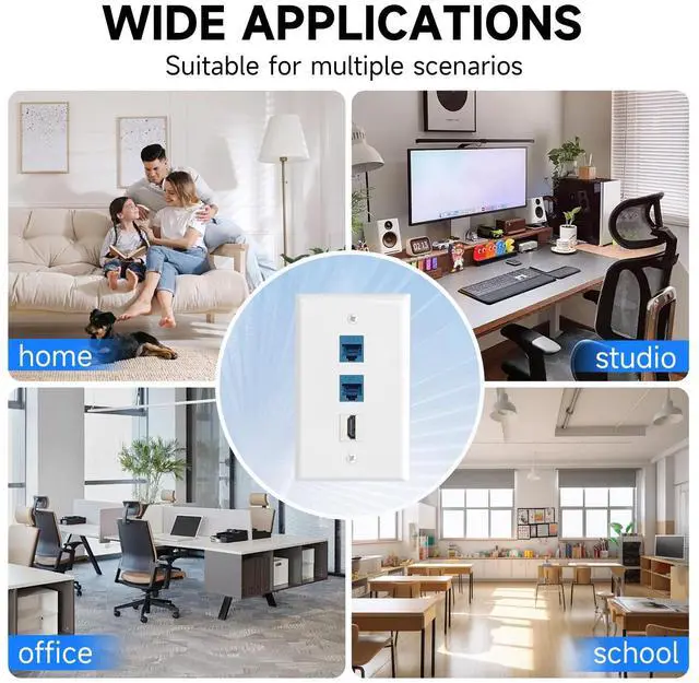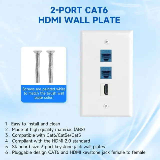 HDMI+Ethernet CAT6 Wall Plates: The ethernet wall outlet fits flush to the wall and runs the ethernet/HDMI cable from one side to another end. Ethernet RJ45 keystone jack is compatible with Cat6 Cat5 Cat5e network ethernet cable. Hide the cables in the wall and maintain a clean appearance, free from wire mess. You can decorate the walls in your home or office to conceal cables.