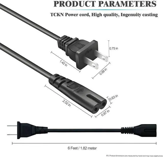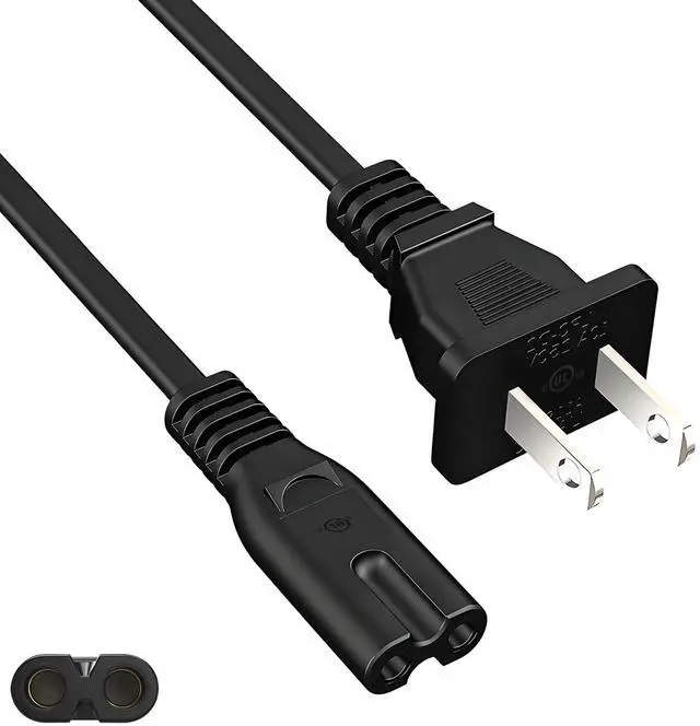 Power Cord Type: Figure 8 Power Cord - IEC 60320 C7 to NEMA 1-15P - 6 Feet, 18 AWG, 125V 10A, Non-Polarized 2-Prong.