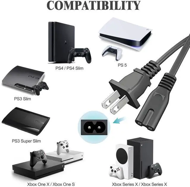 Compatibility: Fit for PS4, PS4 Slim, PS5, PS5 Slim, PS3 Slim, PS3 Super Slim, Xbox Series X, Xbox Series S, Xbox One X, Xbox One S, TVs, printers, soundbars, speakers, Electric Lunch Box, Recliner Chair, and other electronics that require a 2-Slot plug power cord.