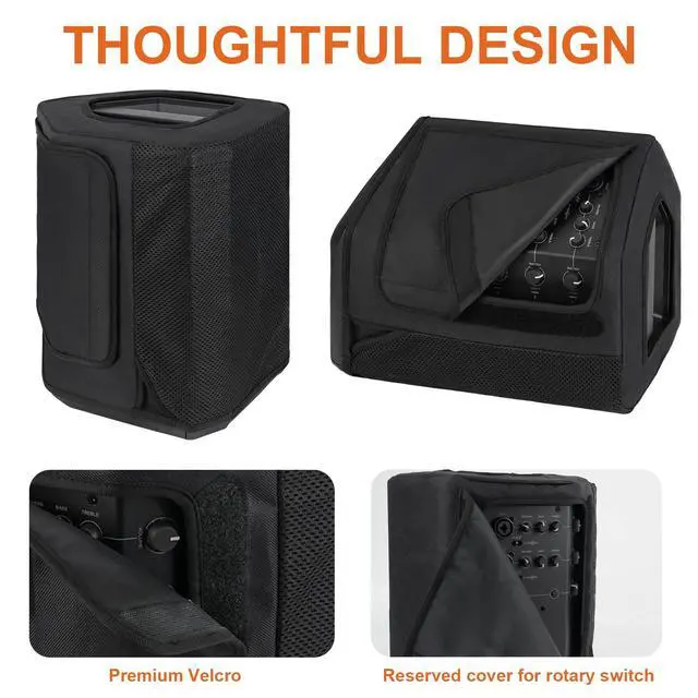 Thoughtful Design The knob switch on the side of the slip cover is fixed with high-quality Velcro, making it easy to open and adjust the speaker buttons and cable connections. The reserved handle opening on the top is convenient for carrying, allowing for easy transport of the speaker without removing the cover.