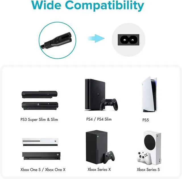 Compatible with PS5/PS4/PS4 Slim/PS3 Slim power cable. NOTE: NOT Compatible With Original PS3 Fat