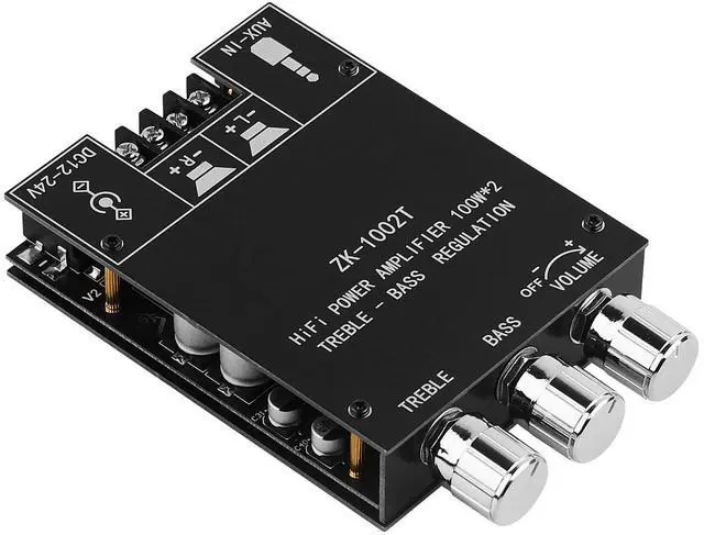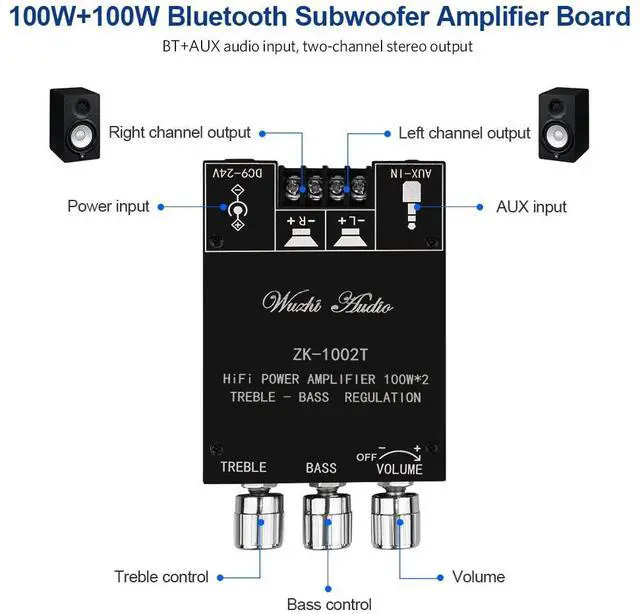 Audio Power Amplifier BoardFeaturing a power output of 100W+100W and Bluetooth 5.0 wireless connectivity, this amplifier supports Bluetooth and AUX input, as well as 2.0 channel stereo output with minimal sound distortion. It also includes treble and bass control, with additional functions available through the accompanying app. Please note that when using AUX mode, ensure that the Bluetooth connection is disconnected.