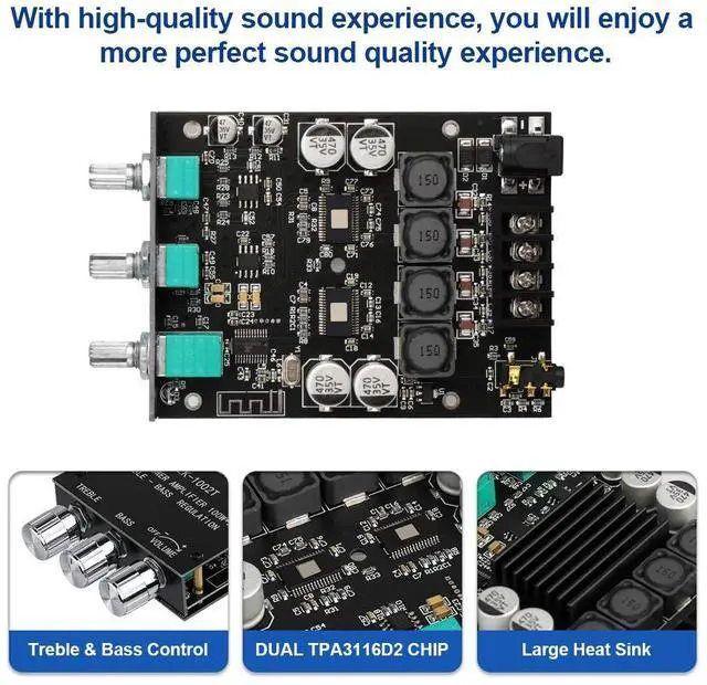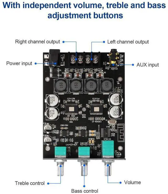 Treble and Bass AdjustmentThe amplifier board includes independent treble and bass adjustment buttons, allowing you to modify sound directly on the module without the need for a player or speaker. For those who appreciate detailed sound effects, these buttons provide the flexibility to tailor audio to your preference.